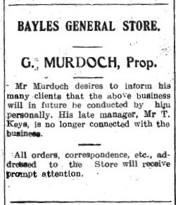 First advertisement for George Murdoch's store at Bayles (then known as Yallock)